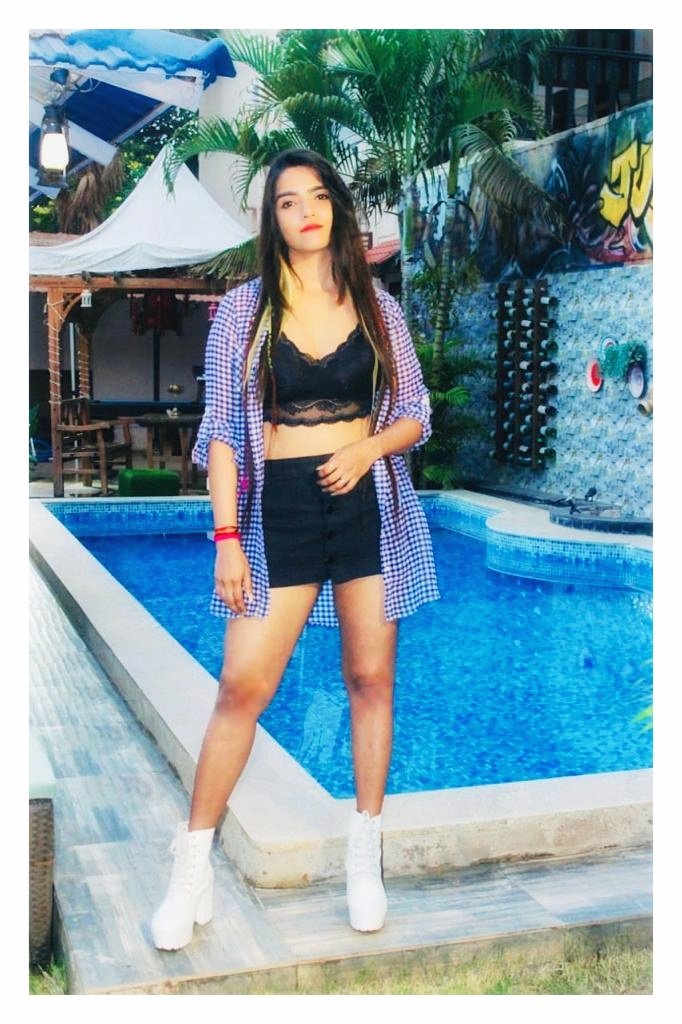 If you are planning to hit a pool party. But you are confused about the dress & bikini to wear. Here our model have a gorgeous outfit for you which you goes trending in lavish pool parties. Several designers picked up florals for spring, which isn’t groundbreaking, But picking up black is everlasting. A black skirt with crop Top Bra with a Purple long Shirt make your way to the pool party like queen. but there’s no denying that’s what we want to see and wear something new. The black is always better. Don’t jump into the pool without taking off your white boot heels!! Lol
